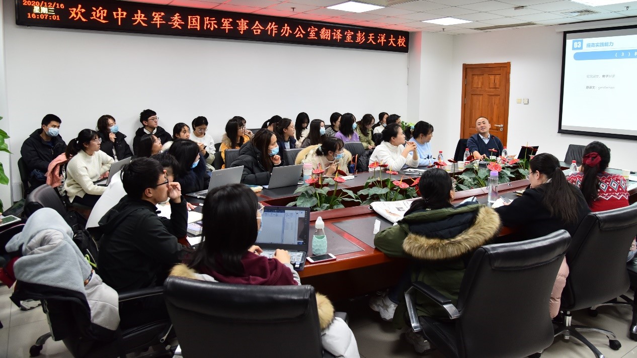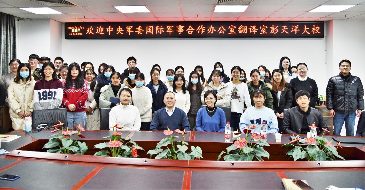 2020年12月16日下午15:00-17:00,应外文学院李文婕老师之邀,中央军委国际军事合作办公室翻译室主任彭天洋大校于后主楼1020会议室开讲,主题为“增强交际意识,讲好中国故事——浅谈中国特色政治外交话语外译中译者的角色与能力”。