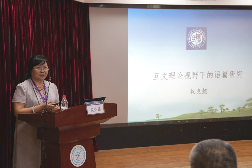 与会代表集体合影后,华南农业大学黄国文教授做“关于‘和谐话语分析’的构想”的主旨发言,对所提出的“和谐话语分析”(Harmonious Discourse Analysis)的背景、哲学思考、理论支撑、研究方法、分析重点进行勾画,同时对和谐话语分析的理论价值和现实意义进行探讨。复旦大学祝克懿教授的发言题目是“互文理论视野下的语篇”,互文语篇研究逐渐将研究重心转移至篇章层次,注重系统形式结构和语义内容的有机统一。