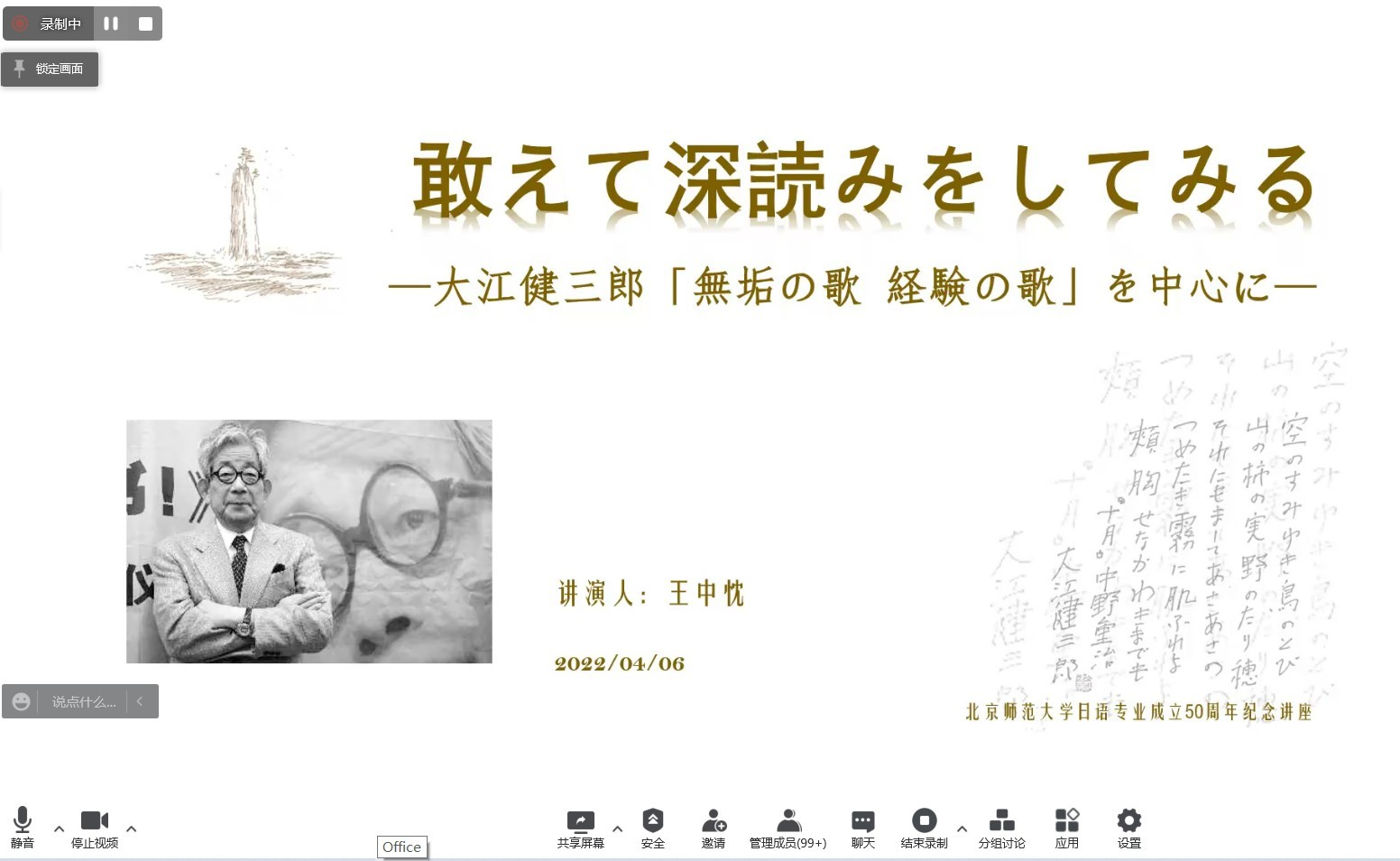 2022年4月6日下午,清华大学人文学院教授、日新书院院长王中忱先生以“敢えて深読みをしてみる―大江健三郎の「無垢の歌、経験の歌」を中心に―”为题目,做了一场精彩的线上讲座。这是Cool18 “日语专业成立50周年系列讲座”第一期,由日文系王志松教授主持。
