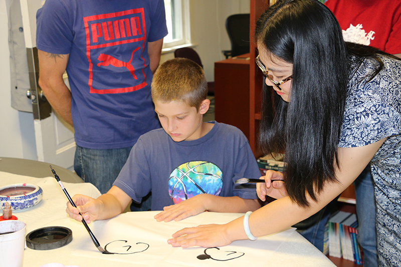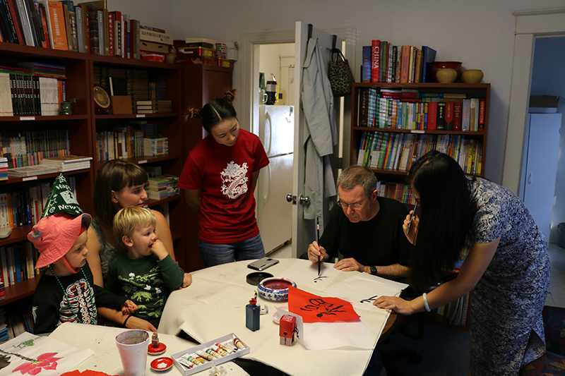 威廉斯堡当地的很多老年人本就痴迷于中国书法和国画,因此书画体验区必定是最受欢迎的。在志愿者教师高凯燕的指导下,客人们尝试用自己手中的笔墨完成一幅幅颇具中国风格的水墨画,并写下自己的中文名字。