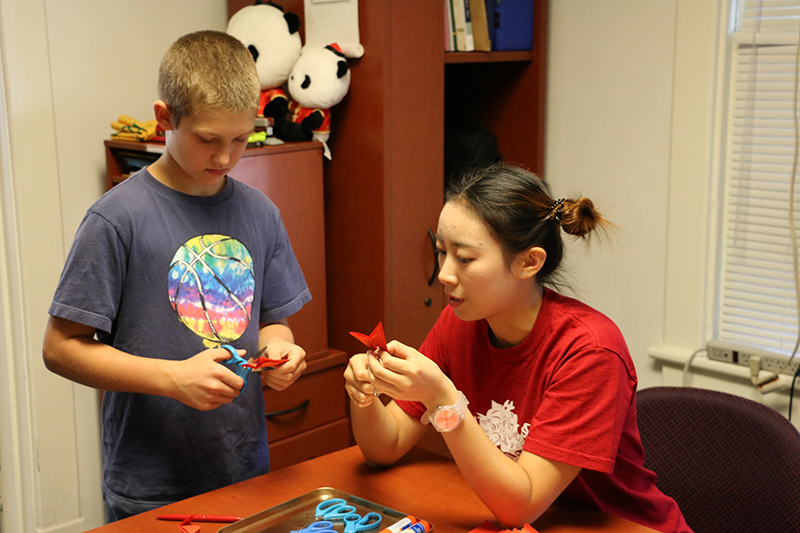 剪纸体验区则深受孩子们的喜爱,孩子们在志愿者教师的指导下剪出可爱的熊猫、翩翩起舞的蝴蝶以及简单而又富有中国特色的窗花。