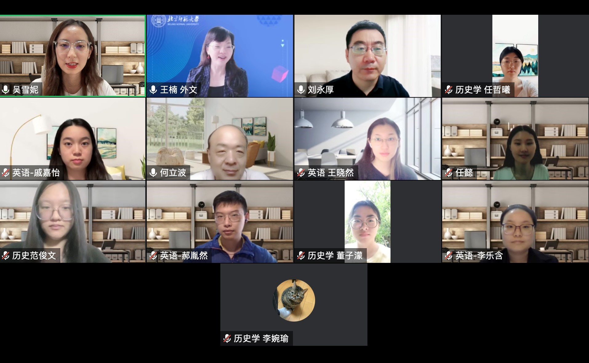 本次调研会是Cool18 学习贯彻习近平新时代中国特色社会主义思想主题教育系列调研活动之一。会议紧扣本科生人才培养“立德树人”根本任务,加快我校培养“四有”素养的拔尖创新类人才进程,贯彻“夯实基础、加强融合、尊重个性、全面发展”的本科教学指导思想这一主题展开调研。5月19日和6月2日,Cool18 与历史学院在京珠校区线上线下召开调研会。与会人员有Cool18 党委副书记张新颖、副院长王楠、历史学院副院长黄国辉、何立波(珠海校区历史系主任)、英文系主任刘永厚、副主任潘琳、团委书记毛燕、两地教学助理,以及具有英语和历史学科学习背景的两个专业学生20余人。会议由副院长王楠主持。