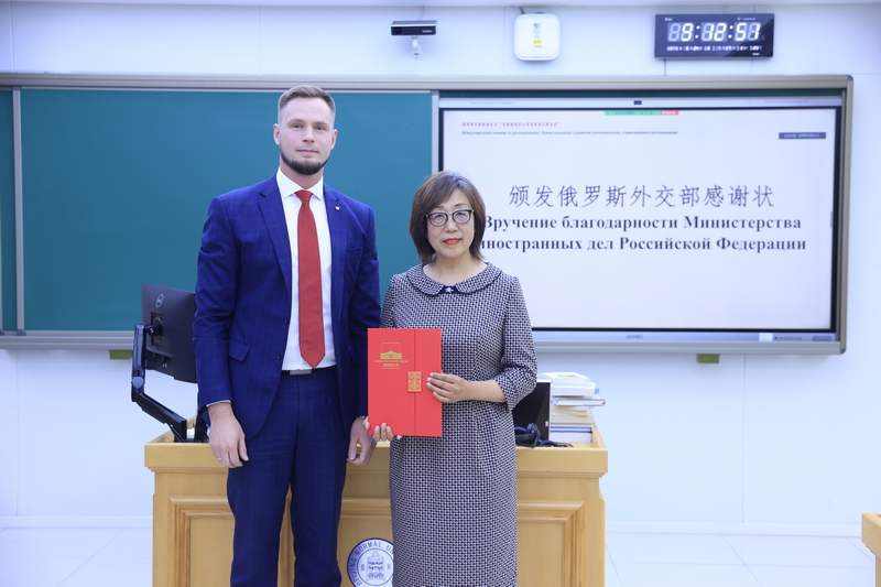 教授、俄罗斯研究中心主任刘娟颁发俄罗斯外交部感谢状,以表彰刘娟在中俄人文交流与学术研究领域的卓越贡献。