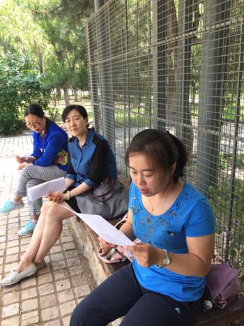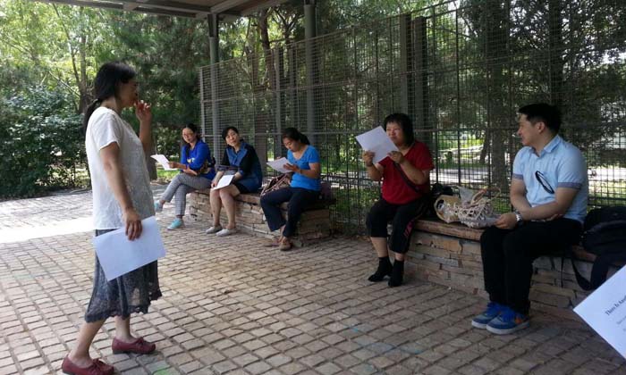 观察活动结束后,大家找到一个阴凉僻静之处,开始处赏析中外山水诗和田园诗选。支部成员依次朗诵了自己喜爱的一首诗,共同体验了曹操的《观沧海》、谢灵运的《登池上楼》、陶渊明的《饮酒》、泰戈尔的《榕树》、哈代的《变形》、迪金森的《另一片天》等十三位诗人笔下的自然奇观和天人合一的美好画面,同时结合工作、学习、生活讲述了自己的体悟。