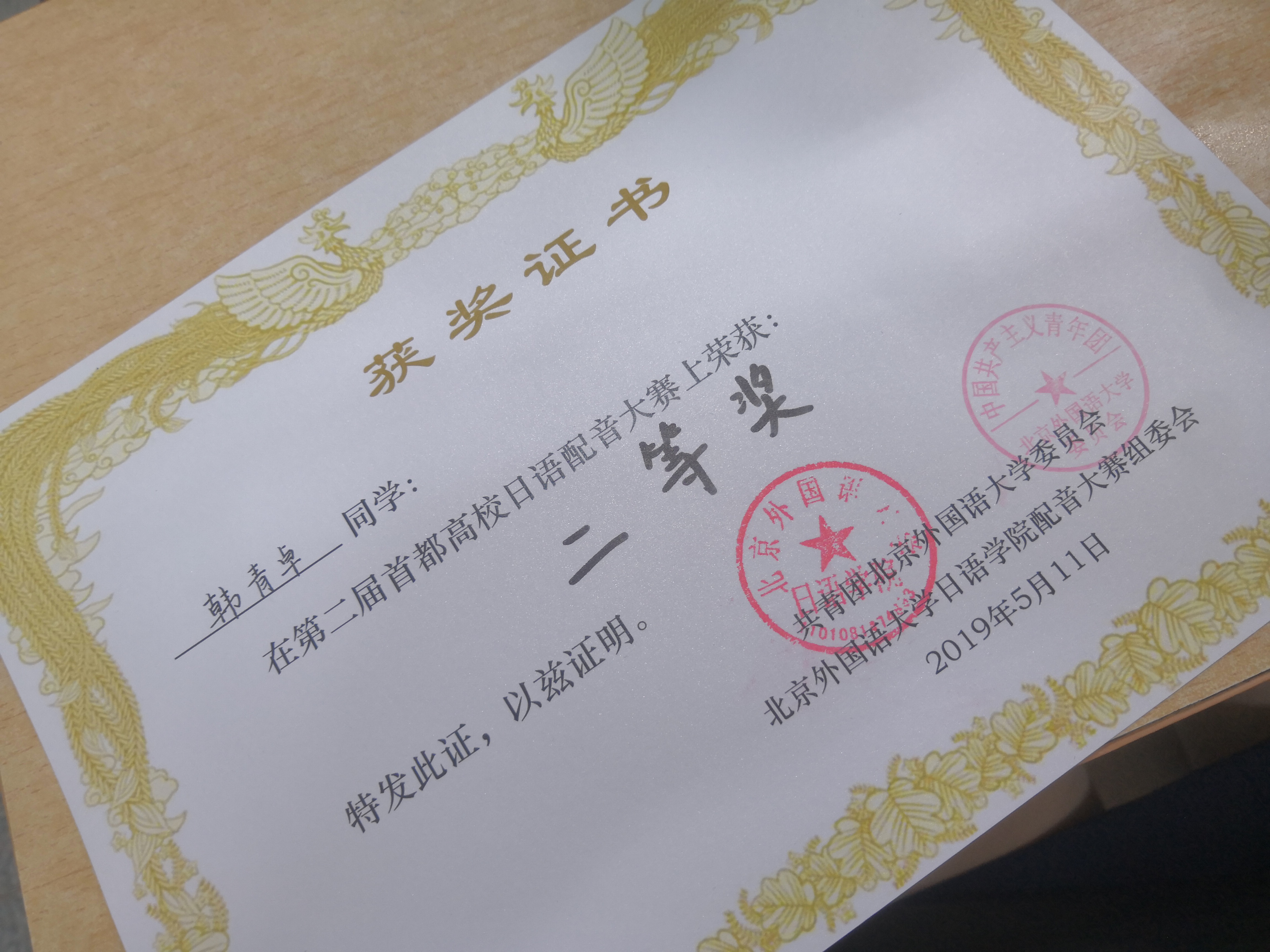 日文系2018级韩青卓同学喜获首都高校日语配音大赛第二名