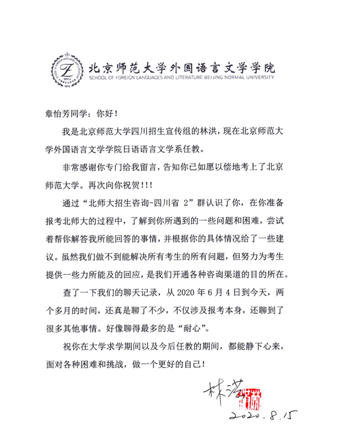 章同学:有的,有一个很感谢的人,是北师大招生组的林老师。在报考过程中,林老师帮助了我很多。因为快高考了,而且北师大又是我的梦想,所以得失心重,十分紧张。林老师安慰鼓励我,一直陪伴着我的报考过程。录取结果出来后,我给林老师写了封信表达我的感激。后来林老师还回信了,和录取通知书一起寄了过来,我真的特别感谢,也特别感动。林老师帮助我的不只是报考这件事,更教会了我重要的人生道理。