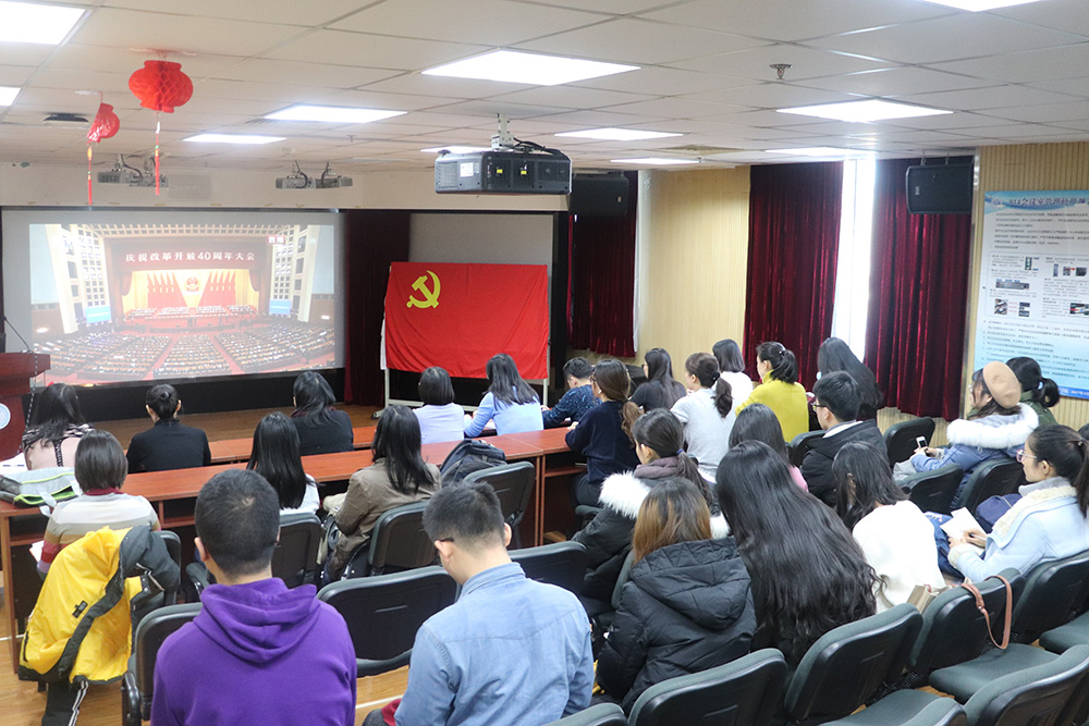 12月18日上午十点学院组织师生在后主楼914观看庆祝改革开放40周年大会直播。学院党政联席会成员、理论学习中心组成员、党委委员、教工党支部、学生党支部、辅导员班主任等参与了本次活动。