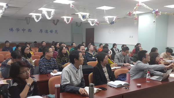 报告中,高教授首先概括了过去半个世纪中英语二语认同的典型模式及其变化,在此基础上提出了四种认同的典型模式:“忠实的模仿者”、“正规的发言者”、“嬉戏的编创者”、“对话的交流者”。然后讨论了以上各模式的特征、二语研究话语、社会和思想潮流之情境,以及困境。高教授的这一理论探索和建构给二语学习者和外语研究者提供了一个极具启发意义的新视角。讲座最后,高教授对来自外文学院不同研究方向的师生的问题进行了细致耐心的解答,会场对话、交流气氛浓厚。大家纷纷表示深受启发,获益匪浅。