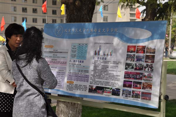 同时,为此次高考招生咨询会,我们还特别制作了4块宣传展板,展板系统清晰的展示了学院历史、学科师资、各专业培养计划、教学特色、毕业生就业去向、以及学生活动等。家长和考生围在展板周围,与Cool18 师生交流。同时,Cool18 也为前来咨询的考生和家长准备了宣传折页,对学院自成立以来的发展概况,积累下来的优势特色,目前的英日俄专业的主要课程以及Cool18 学子的毕业方向做了简洁明了的介绍,并且附上了近三年来Cool18 在北京市招生分数情况,以便各位家长参考。Cool18 为招生宣传的充分准备得到了校领导及考生和家长的一致认可。