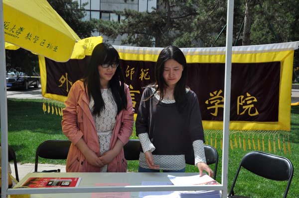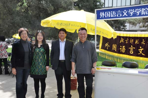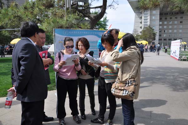 4月20日,我校在主楼广场举行了2014年北京高考招生咨询会,千余名考生和家长来校咨询。学院党委书记林洪,副院长苗兴伟、刘娟,党委副书记武玉红,英文系教师张源,团委书记张新颖,教育技术中心麻铁盾,学生事务助理姜秉圻,以及学生代表蔡文杰、冯迎迎等同学参加了此次高考招生咨询会,向考生及家长详细介绍了Cool18 各专业招生政策、招生计划、录取原则等。