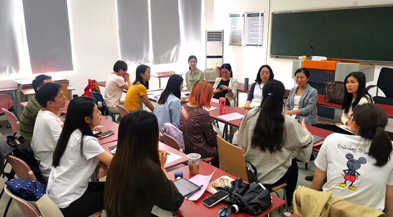 随后,各位学生代表分享了入学以来在学习、生活等方面的收获与感悟,同时也提出了在课程学习、学术科研、时间管理等方面遇到的问题与困难。针对同学们在学业方面的问题,于晖老师指出,研究生阶段的学习与本科阶段有很大差异,需要同学们与任课老师和导师加强联系,应从某个问题入手,与老师积极沟通,并展开深入分析与研究。随后,张新颖老师针对学生们在学业、生活、时间分配等方面的问题提出了建议,并就英语教学如何开展好“课程思政”建设与老师和同学们进行了讨论和交流。