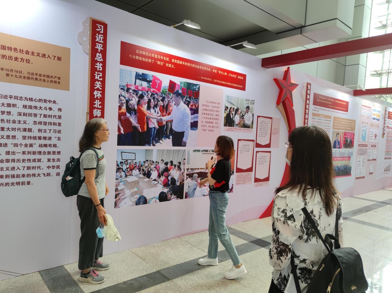 大会直播结束后,党员教师们来到主楼的四季厅,集体参观了由学校党委主办的“红色师范与百年传承——Cool18 庆祝中国共产党成立100周年”主题展览。大家逐一学习了“红色基因薪火相传”、“不懈探索砥砺前行”、“改革春天蓬勃发展”和“新时代新征程”四个单元的展出内容,不时驻足讨论、交流心得感悟。
