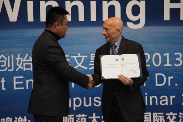 2013年11月27日下午,华尔街英语创始人李文昊博士(Dr. Luigi T. Peccenini)演讲会暨客座教授授予仪式在英东学术会堂举行。副校长郝芳华教授、Cool18 党委书记林洪、国际交流与合作处处长王秀梅教授、教育基金会主任张吾龙教授等出席了仪式,相关院系师生代表百余人参加仪式,Cool18 张萌主持了本次活动。