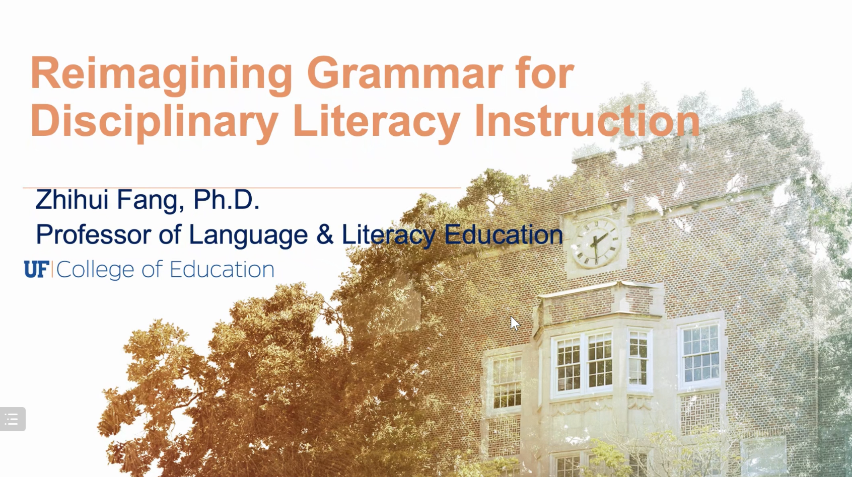 本次讲座的主题是“Reimagining grammar for disciplinary literacy instruction”,讨论了在相应学科背景下进行语法教学的必要性和可行性。方教授从学术读写(academic literacy)教学的范式转向谈起,近年来,学者对于学术读写的研究从内容区域读写(content area literacy,CAL)转向学科读写(disciplinary literacy,DL)。通过对两种模式的详细对比,方教授指出学科读写方法在提升学生学术读写能力上的优势。随后,方教授结合自身教学经历阐释在学科读写中进行语法教学的重要性,并给出文学语言、自然科学语言、数学学科语言、历史学科语言的具体实例说明语法在不同学科中的体现。面对如今语法教学中的困境,方教授指出需要重构语法教学模式,在相应学科背景下进行有针对性的语法教学,从而让学生深刻理解语法背后所包含的意义,在具体语境中使用合适的语法。系统功能语法便能很好地实现这一目标。接下来,方教授呈现了这一教学模式的具体操作,首先帮助学生创设知识语境、建立学科思维,然后引导学生关注语法,从经验意义、逻辑意义和语篇意义三个视角看语篇中具体的词汇语法体现,并结合相应练习巩固所学。