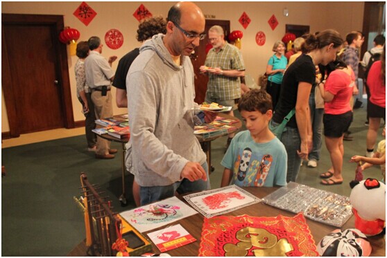 为了配合表演,威玛孔院还在剧场的Dodge Room举办了中秋招待会,请大家品尝月饼和水果,并欣赏中国文化的图书展示。志愿者刘芷廷和邹小婧一旁演奏琵琶助兴。