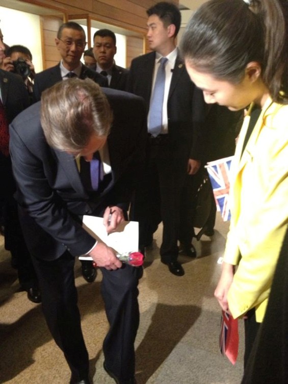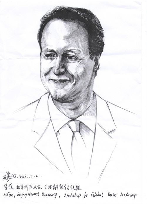 在其参观期间,Cool18 博士生张萌代表中国青年欢迎英国首相卡梅伦到访,并代表中国青年向卡梅伦首相赠送了我校李存同学连夜为卡梅伦首相画的素描画,还有英国的国花——红玫瑰,让首相有了宾至如归的感受。