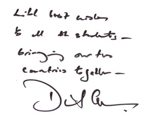 卡梅伦首相很喜欢我校同学赠送的这些“来自中国青年的具有爱心”的礼物,很高兴地为“全球青年领导力工作室”的青年们寄语:“把美好的祝福带给青年们,是你们使两国关系更加紧密!——英国首相卡梅伦”