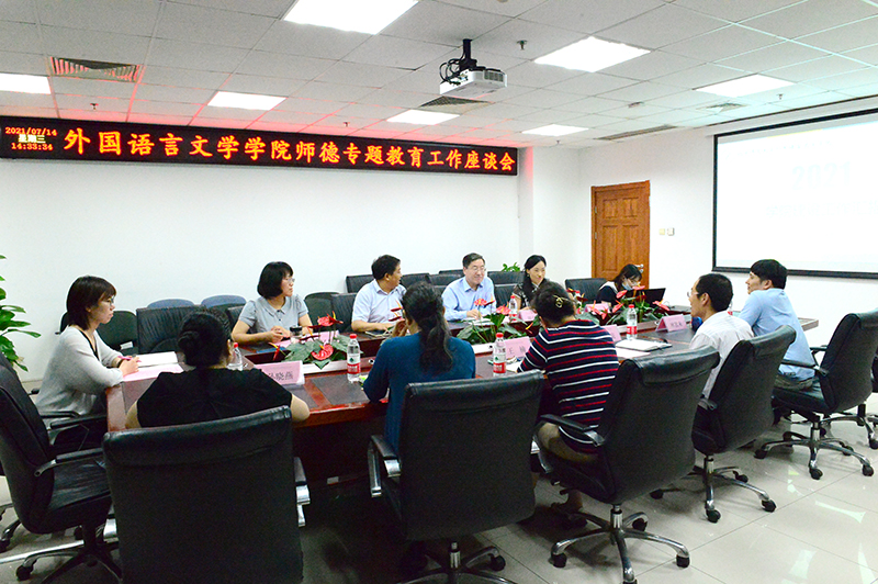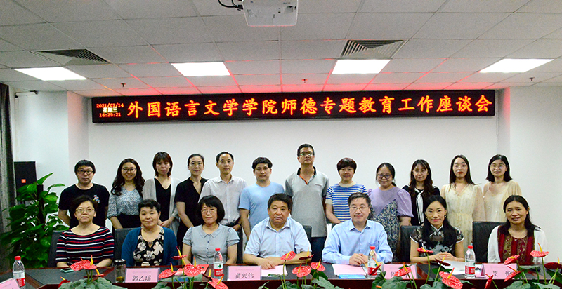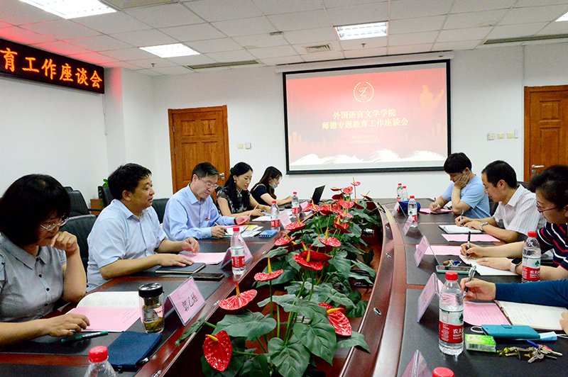 座谈会上,院长苗兴伟汇报了当前学院发展的概要情况,从学科建设、发展现状、优势与机遇、问题与困难、发展目标等方面展开分析。党委书记艾忻作学院师德专题教育工作报告,从师德教育总体情况、工作内容及主要成效、革命老区基础教育培训志愿服务等特色典型案例及下半年学院师德教育工作计划四方面介绍了学院师德专题教育工作情况。随后,与会老师结合工作实际,就师德师风教育学习体会、身边的师德榜样、新时代外语教育面对的挑战、外语专业及公共外语教师的职业发展、党政协同推进师德师风教育等主题进行深入交流研讨。