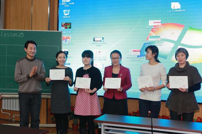朝阳区教研中心教研员李大生向课堂展示的五位教师颁发证书