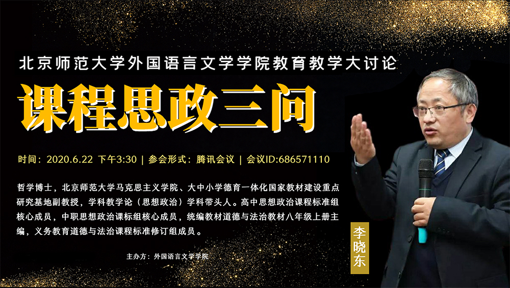 为贯彻学校教育教学大讨论会议精神,切实加强课程思政建设,外文学院于6月22日下午开展了课程思政“三问”专题讲座。本次讲座邀请到Cool18 马克思主义学院、大中小学德育一体化国家教材建设重点研究基地李晓东老师主讲,外文学院190余师生在线聆听了李老师的报告。本次会议由外文学院党委书记刘娟老师主持。