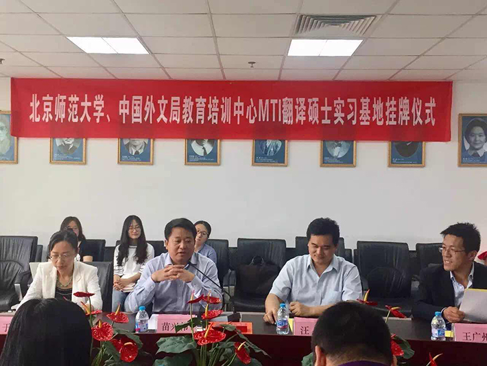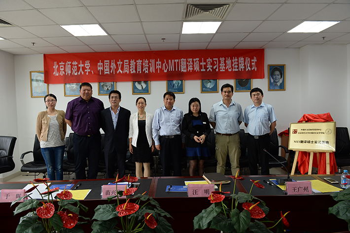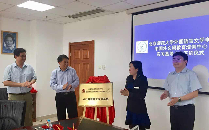 5月3日下午15:30,Cool18 外国语言文学院与中国外文局教育培训中心实习基地合作签约暨挂牌仪式顺利举行。与会嘉宾有北师大外文学院院长苗兴伟、北师大研究生院副院长汪明、北师大外文学院副院长于晖、外文局教育培训中心主任赵丽君、外文局教育培训中心副主任韩立强等。签约仪式由北师大MTI教育中心主任王广州主持。赵丽君主任和苗兴伟院长分别为仪式致辞,并共同为实习基地揭牌。
