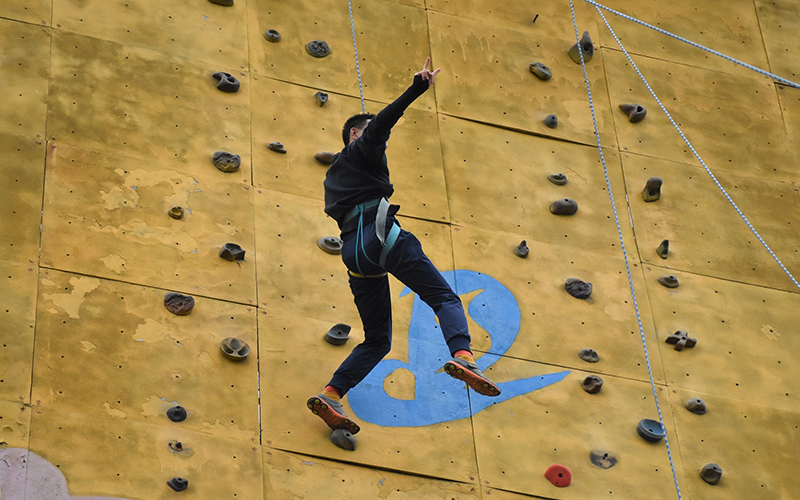 在第一个项目“步步高”环节中,队员们团结一心,在两名队长的带领下成功通关。接下来,两队来到了第二个项目“飞降”处,此项目需要同学们乘坐高25米,长300米的溜索到达对岸。队员们互相鼓励,最终都成功完成了挑战。在第三个攀岩项目中,亓振华老师和高静同学成功登顶摇铃,他们拼搏的精神和不俗的表现引得队员们发出阵阵欢呼。