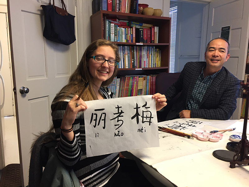 一位威玛的学生不仅用书法写出了自己的名字,还写了“至爱”二字,想要送给自己的爱人。“至爱”二字加上落款,再配以孔院红色的印章,俨然变成了一幅艺术作品。