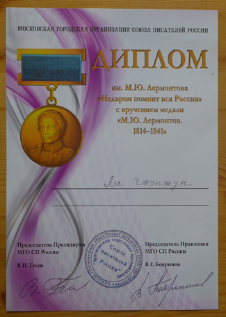 2014年5月30日,在车臣首府格罗兹尼的莱蒙托夫国际学术研讨会闭幕式上,大会执行主席玛丽雅姆•瓦西托娃代表莫斯科市作家协会组织向中国参会代表、Cool18 文学院教授、教育部区域和国别研究培育基地Cool18 俄罗斯研究中心专职研究员李正荣颁发了“莱蒙托夫”奖章。李正荣在接受奖章时表示:这是一项巨大的殊荣,他本人根本无资格担当,只能把这一荣誉当做俄罗斯文学界对中国的莱蒙托夫传播者的奖励。