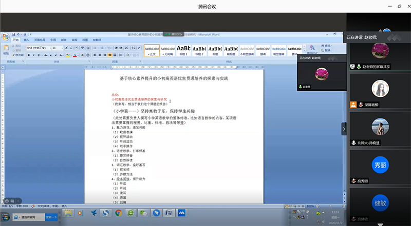 2020年11月2日下午,Cool18 外语教育与教师教育研究所与陈经纶中学开展“核心素养下的小初高英语优生贯通培养实践研究”论文集指导工作坊。我所孙晓慧副教授和潘琳副教授参与指导本次工作坊活动。通过“线上”腾讯会议的方式,两位专家对陈经纶中学英语组正在编写的论文集的框架和内容等方面进行指导,并提出了修改建议。