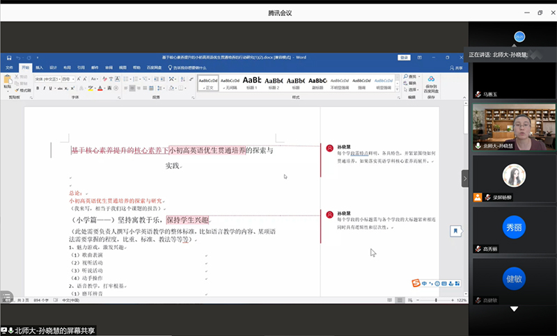 接下来,孙晓慧老师对论文集框架中存在的问题进行了标注,并通过屏幕共享的方式具体向各位老师指出问题所在,并提出改进建议。同时,她对潘琳老师提出的精简论文集题目这一建议深表认同,并拟定修改后的论文集题目。最后,孙老师对该校侯老师的课题申报给予充分的鼓励,给到建设性的建议,并与侯老师进行课题探讨、为其答疑解惑。