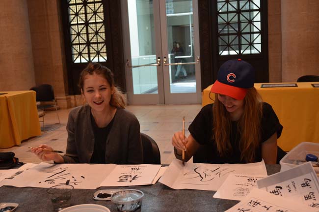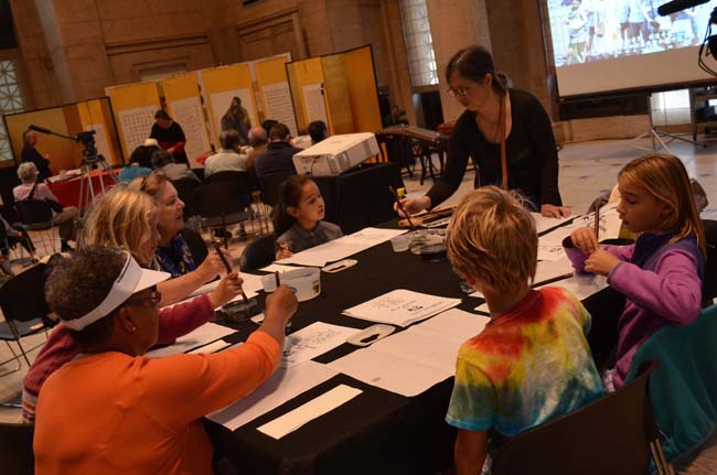在精彩的古筝伴奏下,加州大学伯克利分校艺术系周爱琴教授在画展现场亲自挥毫,为观众展示毛笔书法独特的艺术魅力。开幕式之后,参展观众不断聚集,欣赏画作之余,许多人坐了下来,在现场艺术家的指点下静心临摹,有华发已生的老人,活泼热情的青年,更有充满探索欲望的孩子。