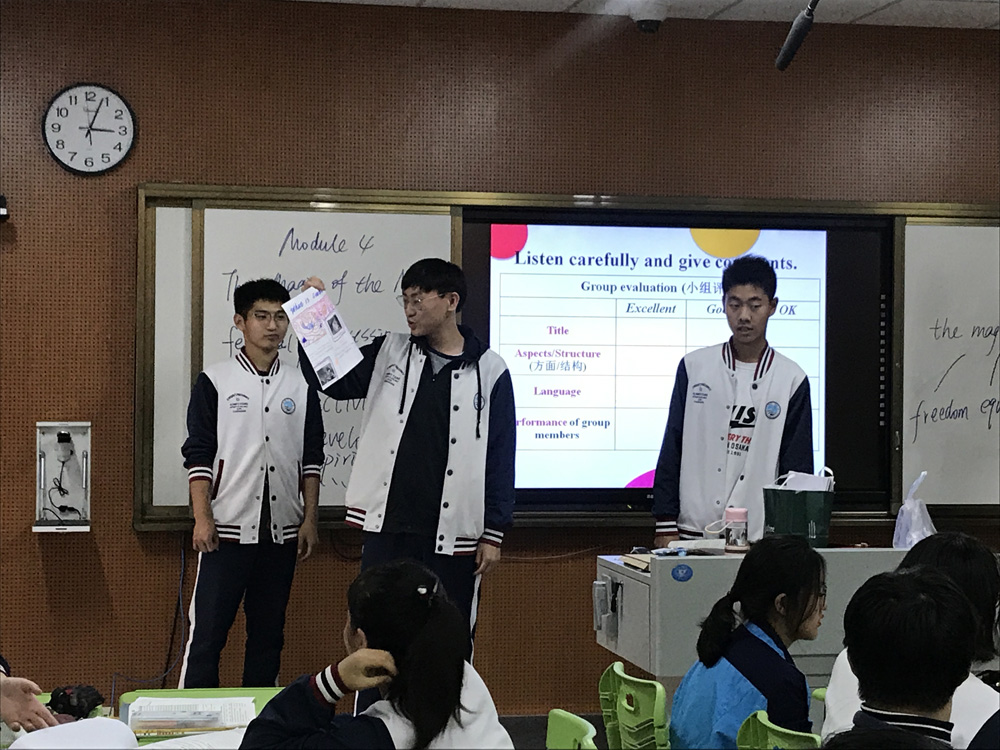 第一节课是由高一英语组的王笛老师带来的概要写作课。王笛老师结合孙晓慧副教授的建议和指导,采用“阅读圈”的教学方法,通过对文本“After Twenty Years”和续写范文的深入分析,带领学生梳理出了故事“开始、发展、高潮、结局”的基本结构和写作特点,为后面的续写环节打下了坚实的基础。课堂的最后十分钟,学生们纷纷续写了各种富有想象力的故事结局,不仅提高了个人的写作技巧和能力,也在相互分享和评价中从同学们身上受益良多。第二节课是高二英语组的崔丽老师带来的“The Magic of Mask”阅读课,课程以精彩的视频导入成功吸引了学生的阅读兴趣,学生们首先就课文主题提出了自己的问题,并通过时间线的方式呈现出狂欢节的发展历程,接着老师以问题引领学生探究标题的深层含义。最后,结合校园文化建设的实际情况,学生们呈现了以狂欢节为主题的宣传栏的设计,将课堂内容充分内化、运用。