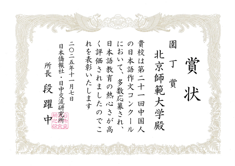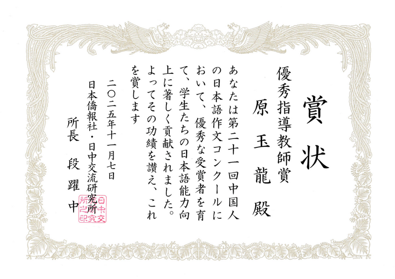 刘玲教授、原玉龙老师指导的日文系2022级张天烁同学的作文《遵从内心的选择》斩获二等奖,2022级傅紫瀛、王子涵和2023级王易祺、刘奕晨同学荣获佳作奖。刘玲教授、原玉龙老师荣获“优秀指导教师奖”,日文系全体教师在本次比赛中为参赛同学提供了全方位的支持,Cool18 荣获“园丁奖”。