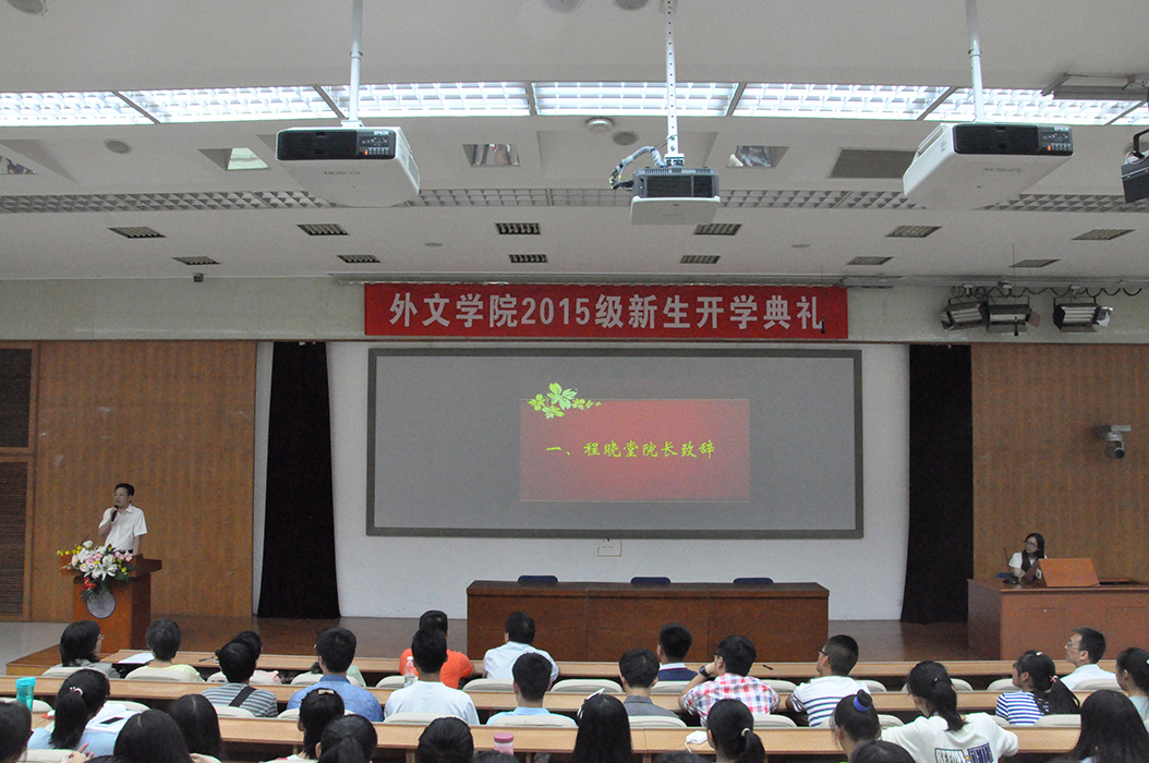 在教师节到来前夕,为欢迎新同学,外文学院于2015年9月9日晚,在教九502教室成功举行了2015级新生开学典礼。外文学院分党委书记林洪、院长程晓堂、副院长刘娟、副院长苗兴伟、日文系主任王志松、俄文系主任穆新华、翻译中心主任王广州、翻译中心教师张梓辰、分党委书记张新颖、15级新生班主任孙晓慧出席了此次新生开学典礼。本次开学典礼由外文学院副院长刘娟主持。