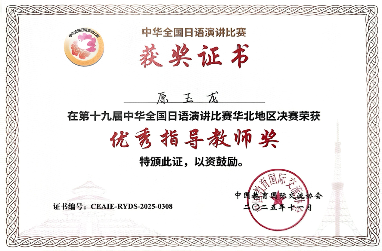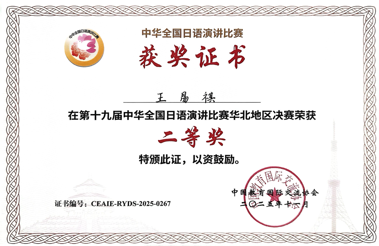 2025年11月15日,第19届中华全国日语演讲比赛华北赛区决赛在天津外国语大学落下帷幕。Cool18 日文系王易祺同学以决赛第五名的成绩获得二等奖,原玉龙老师获得优秀指导教师奖。
