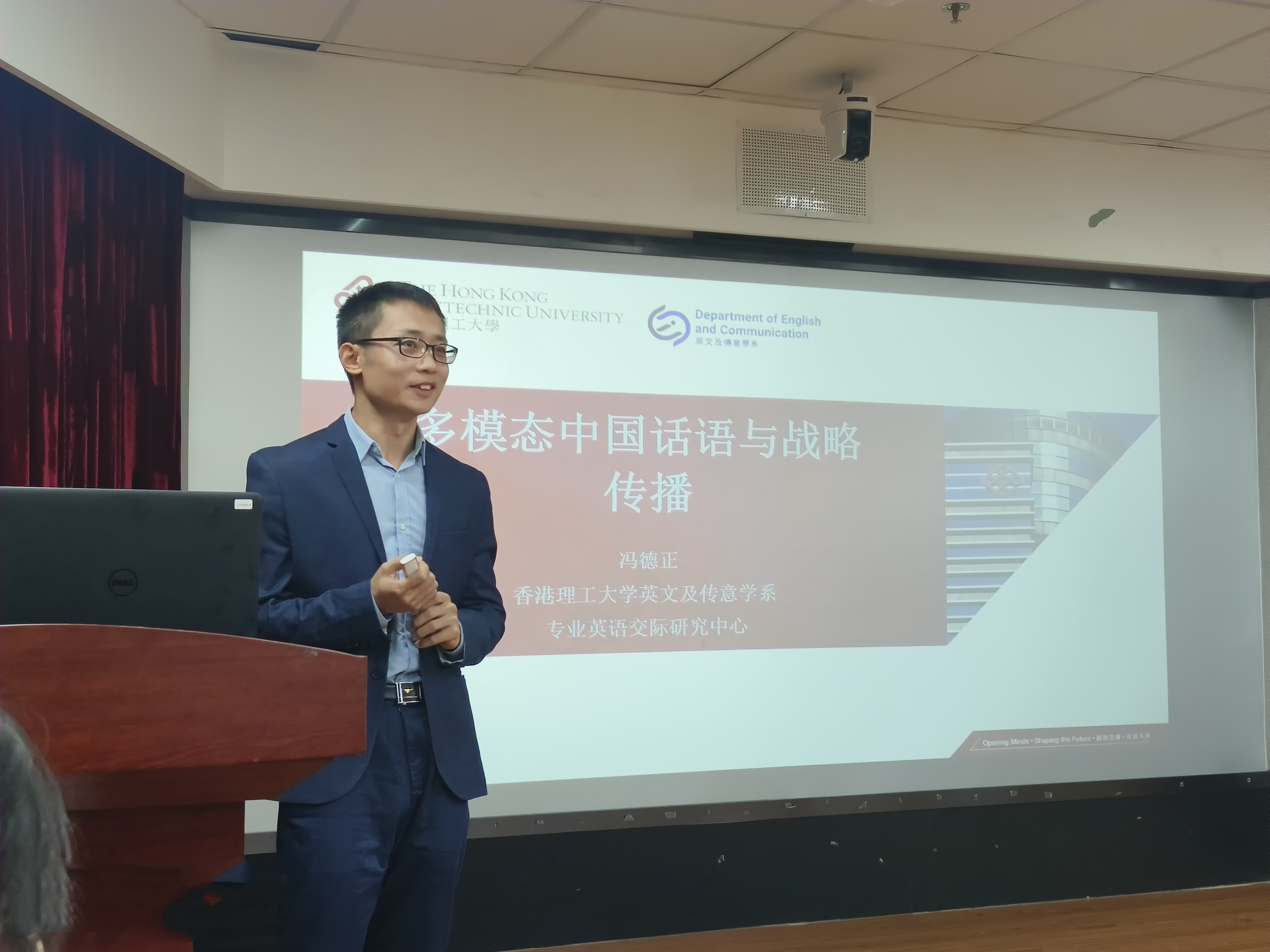 2023年10月13日上午,香港理工大学冯德正博士应邀为我校师生开展了学术前沿讲座“多模态中国话语与战略传播”。讲座由Cool18 苗兴伟教授主持。