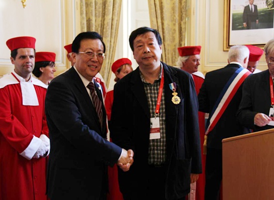 2O14年6月13曰,在联合国教科文组织支持下,北京和平之旅交流中心与法国圣爱美隆市政府主办的《文化遗产红酒、中法建交五十周年》画展在法国圣爱美隆市政大厅开幕。出席此次盛会的有联合国教科文组织大会主席、中国教育部副部长郝平,圣爱美隆市市长伯纳德.劳瑞,欧洲中国文化教育基金会主席、北京和平之旅文化交流中心理事长邵常淳以及圣爱美隆市各界人士。在画展开幕式上,联合国教科文组织主席郝平先生给我校艺术与传媒学院美术与设计系主任古棕老师授予了欧洲中国文化中心的“东方骑士勋章”,以表彰他多年来为中外文化交流所做出的突出贡献。