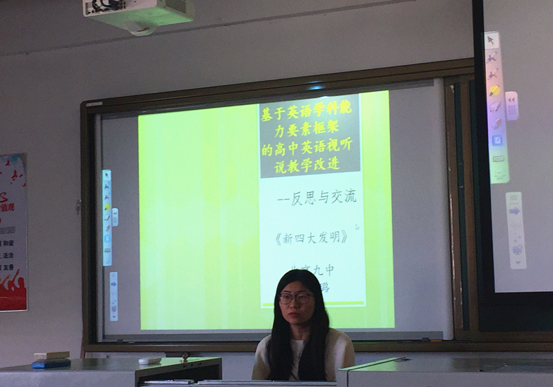接着,北京九中的李璐璐老师也结合具体的教学内容,以“基于英语学科能力要素框架的高中英语视听说教学改进”为主题进行汇报。回顾说课指导、试讲、正式讲三个阶段,她总结自身主要发生了由关注表层信息到关注表达手法,由提取零散信息到结构化输入,由忽视应用实践到关注内化输出三大变化。谈及教学改进反思与感悟,她认为高校研究团队和中学一线教师进行合作是改进教学的有效途径,教师应基于“能力要素框架”分析学情,以“英语学科核心素养”为依据制定教学目标。