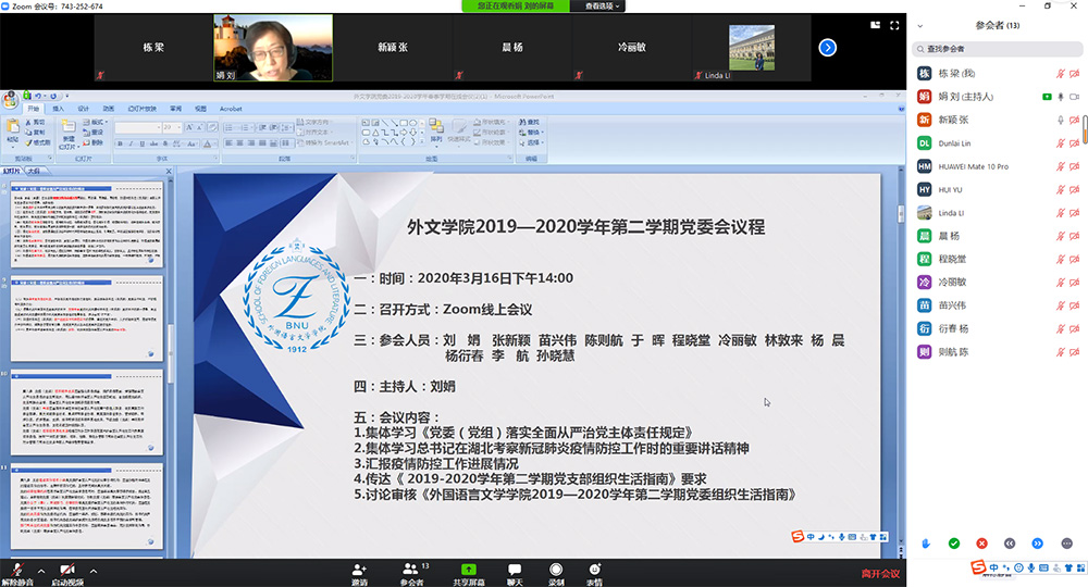 2020年3月16日,外文学院党委通过视频方式召开2019-2020学年春季学期第一次党委扩大会议。会议由党委书记刘娟主持召开,学院党委委员、教工党支部书记参加此次会议。