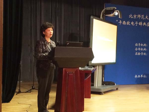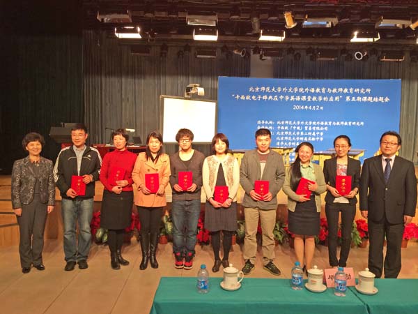 下午13:30,结题会正式开始,会议由外文学院英文系系主任陈则航副教授担任主持,西城外国语学校校长尉小珑致开幕辞,他充分肯定了本次项目对中学英语教育发展的重要意义。接着,外文学院王蔷教授回顾了项目前四期的成果,并详细介绍了第五期项目研究过程与研究发现。随后,西城外国语学校实验教师刘志蓬老师做了主题为“电子辞典在高中课外英语阅读中的应用”的公开研讨课,并对自己的课堂设计思路进行了说课,王蔷教授进行了点评。另外,北师大实验中学的刘鹏程老师与北师大二附中的郑颖老师做了项目分享,与到会老师交流他们参与此项目的过程、体会和研究成果。最后,北师大课题组成员为第五期中学指导教师、实验教师、助研颁发了荣誉证书。