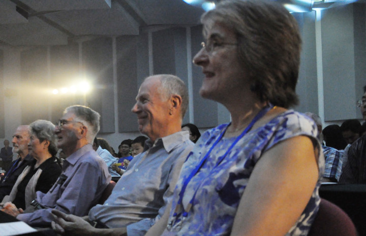 晚会现场,在一曲用西班牙语和葡萄牙语演唱的《生日歌》中,同学们将为韩礼德教授和胡壮麟教授精心准备的生日蛋糕推到台前并献上美好的祝愿,两位教授十分惊喜并现场分享了自己的心情和对同学们的感谢。祝寿环节后,晚会正式开始,当晚的节目异彩纷呈。古典舞《采薇》、踢踏舞《雷电》、管乐民乐精彩演奏、歌曲串烧等节目精彩层出不穷,而表演人员既有外文学院学生和留学生,也有功能语言学学会的专家学者,主持人张萌也倾情献唱,而外文学院党委书记林洪老师的一曲《攀登高山》将晚会推向了高潮。