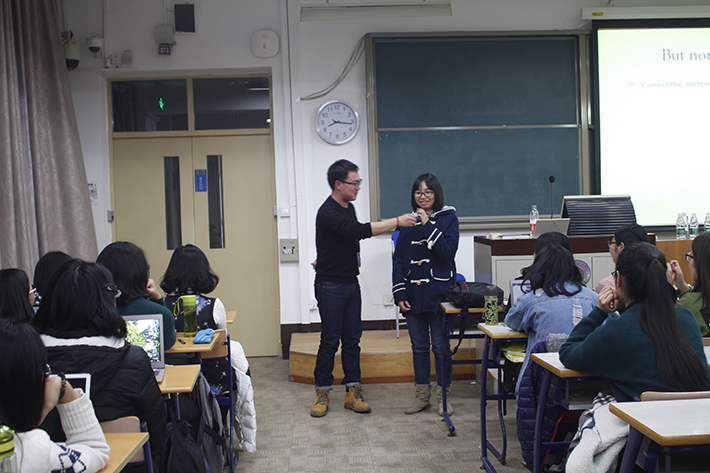 首先,刘老师通过和两位同学的合作为大家展示了一场“别样的”同传和交传。