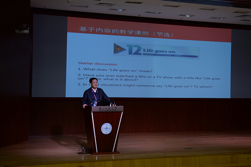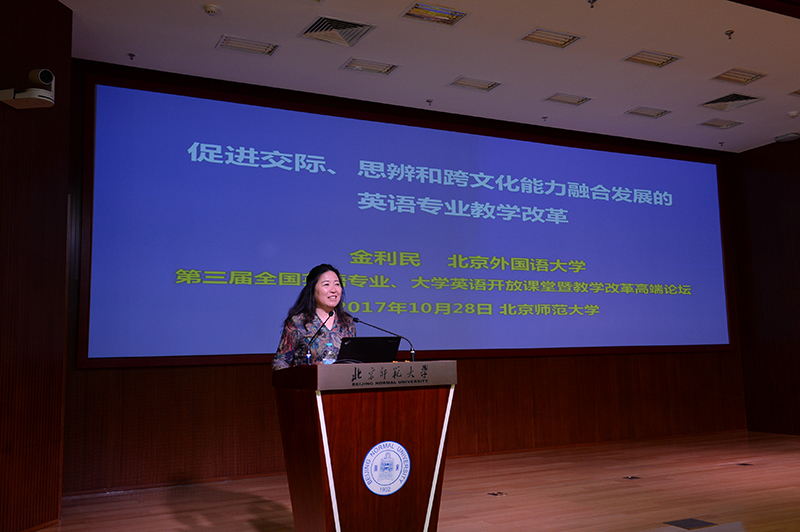 28日上午,Cool18 程晓堂教授作了题为“如何提高外语课堂教学的效果?”的主旨发言。他认为,外语教育界需要继续摸索和探讨有效的外语教学方法,特别是需要探讨课堂上教师应该做什么,实际在做什么,做得效果如何。下午,北京外国语大学教务处处长、英语学院教授金利民老师在她的主旨发言中介绍了北京外国语大学开展的“促进交际、思辨和跨文化能力融合发展的英语专业教学改革”。在发言中,金教授介绍了该校改革和教材编写的背景,阐释改革理念,并以口语教材编写和活动设计为案例,展现如何使交际与思辨和跨文化能力并行发展。
