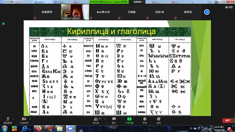 2021年6月28日—7月1日,俄文系成功举办了暑期小学期系列讲座活动。系列讲座共有六场,其中中国专家的讲座两场,包括南京师范大学张杰教授的“人工智能时代的社会科学研究”、Cool18 杨衍春教授的“语言国情学:跨文化交际的基础”),俄罗斯专家的讲座四场,包括莫斯科国立师范大学萨拉帕斯副教授的“俄语字母与俄罗斯文化”与“俄语成语中的文化习俗”、莫斯科国立师范大学切尔内舍娃教授“俄罗斯神话中的文化元素”与“俄罗斯的民间童话”。