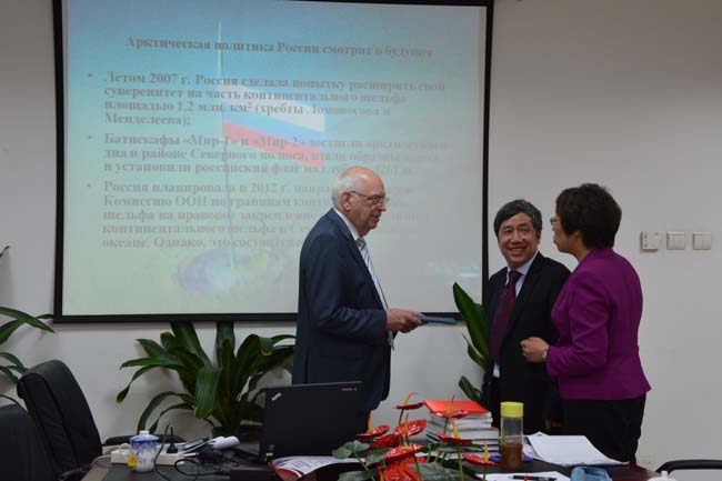 佐恩教授受我校俄罗斯研究中心邀请,为我校师生做了为期三天的讲座。佐恩教授作为里海问题的专家,他所研究的领域和问题具有一定的前瞻性和预见性。鉴于佐恩教授在地理学方面的卓著成就,我校陈光巨副校长亲自授予他有董奇校长签章的客座教授荣誉证书。俄罗斯研究中心与佐恩教授的合作只是刚刚开始,以后中心将定期与其开展多方面的交流与合作。