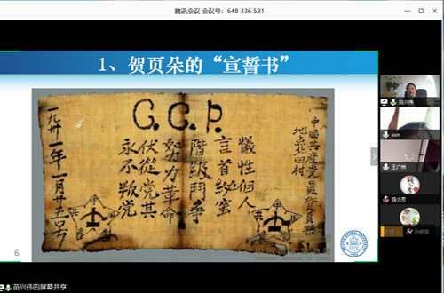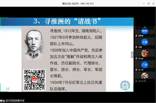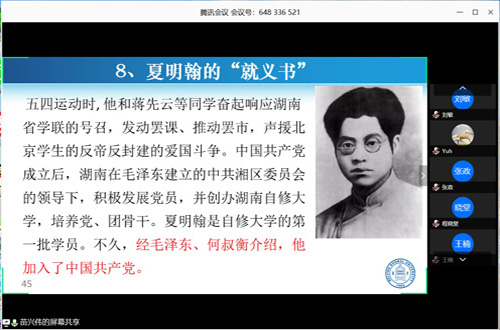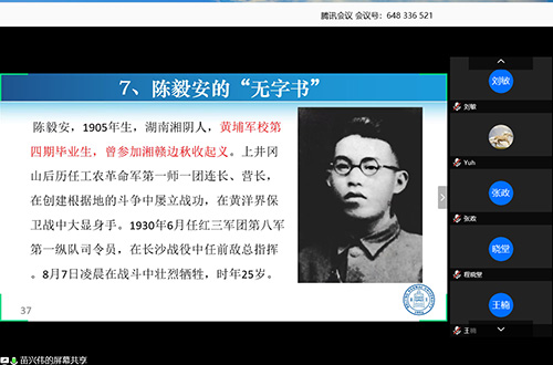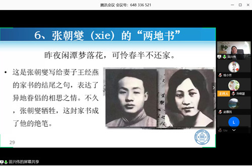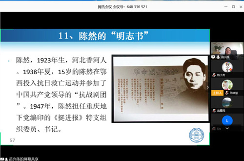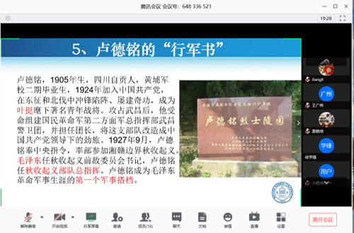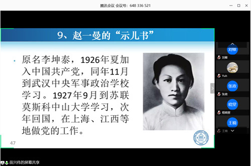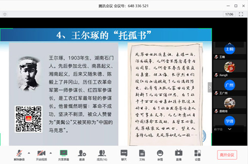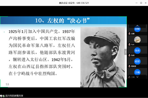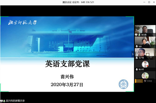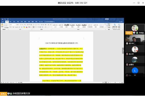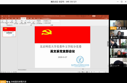 2020年3月27日下午三点半,Cool18 英文系党支部召开了云会议。会议由英文系党支部书记孙晓慧老师主持,通过腾讯会议平台,采取屏幕分享和发言讨论的方式进行,共有十六位党员同志参加了此次云会议。会议首先邀请苗兴伟院长给大家上党课,讲述“十一书”的故事,包括贺页朵的“宣誓书”、傅烈的“绝命书”,寻淮洲的“请战书”,王尔琢的“托孤书”,卢德铭的“行军书”,张朝燮的“两地书”,陈毅安的“无字书”,夏明翰的“就义书”,赵一曼的“示儿书”,左权的“决心书”,陈然的“明志书”。苗老师的党课图文并茂,声情并举,参会同志表示党课学习使我们感受到了革命烈士浴血奋战,拼搏奋发,以革命事业为首任的伟大使命感。随后,孙晓慧书记带领大家学习了习近平总书记在湖北省考察新冠肺炎疫情防控工作时的重要讲话精神。支部党员同志纷纷表示在当前局势下将以抗击疫情和教学科研工作并重,一起努力度过困难时期。此外,孙晓慧书记向大家汇报了英文系党支部本学期的主要支部工作计划,详细讲解了每个月份主要的支部活动计划。