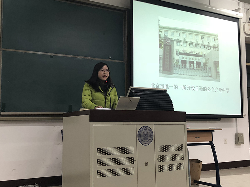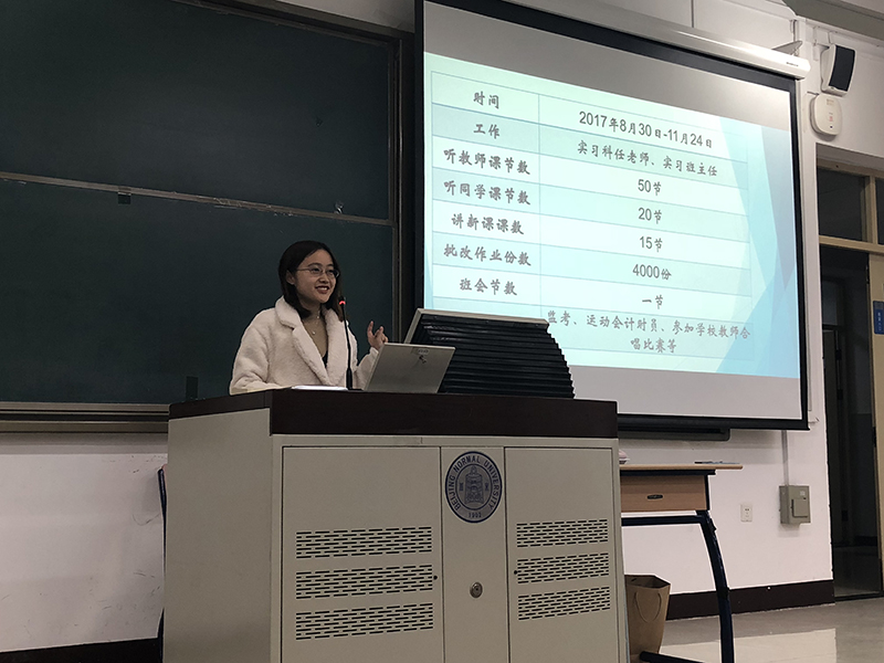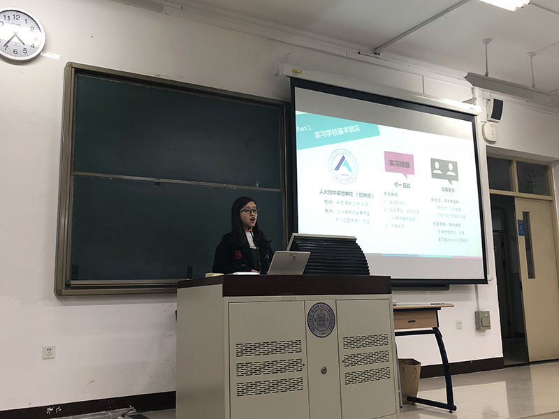 日文系的发言代表王蓉同学分享了她在月坛中学实习的感慨。她表示,教育实习是第一次从学生向老师转变,从言行、着装等细节方面都在积累经验的同时,也建立了与实习单位、实习学校学生的一种联系,这种联系不仅让我们学会怎样进行教学工作,同时也教会我们如何与不同性格的学生打交道,这也是一种能力的提升。