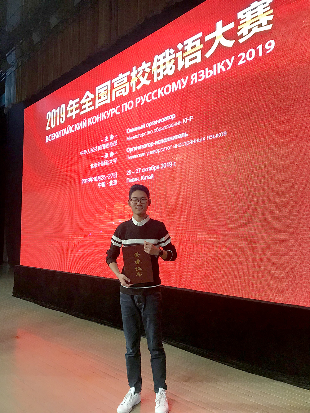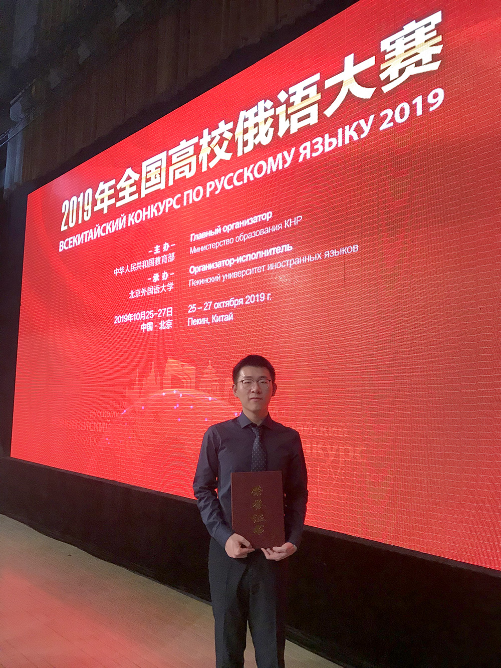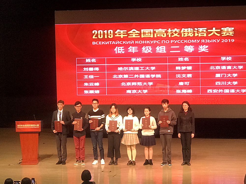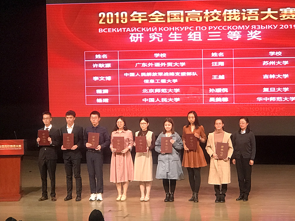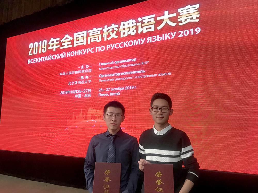 今年北师大外文学院俄文系共派出三名学生参加比赛,经过激烈角逐,2018级本科生朱云峰荣获低年级组二等奖,2019级研究生程潇荣获研究生组三等奖,在比赛中展现出了良好的专业素养与精神风貌。希望同学们再接再厉,不断提高专业水平,努力成为有扎实基础、丰富学识的优秀人才,为中俄两国友好合作发展贡献自己的力量!