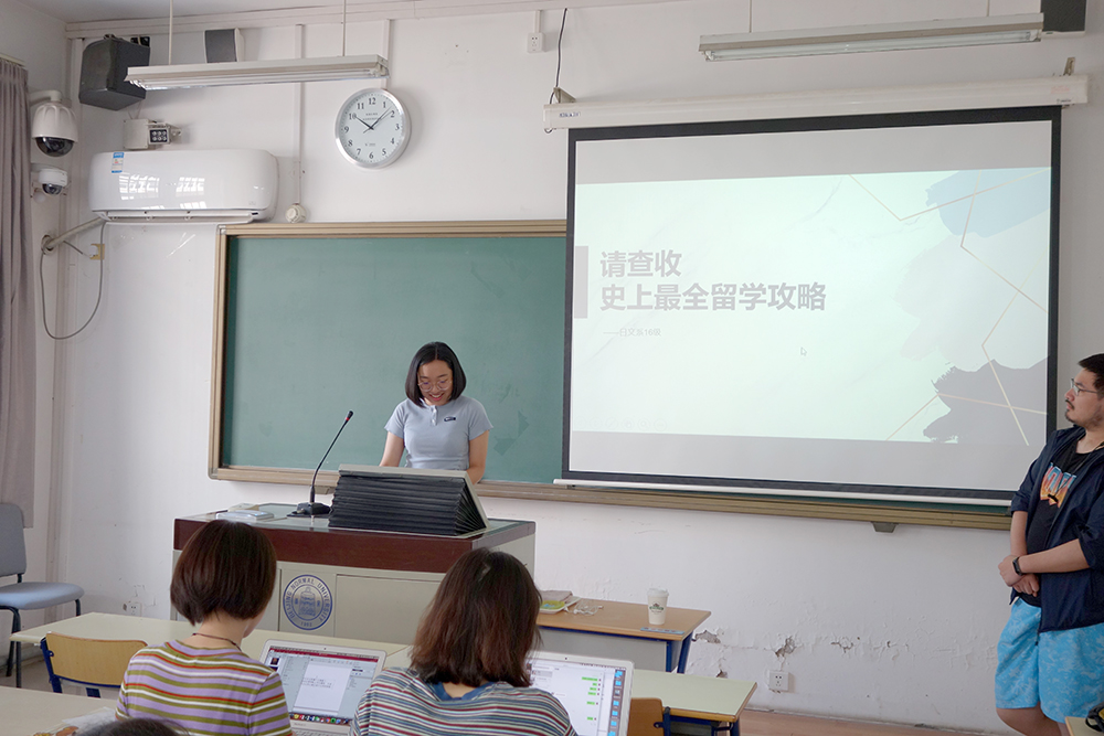 针对这些问题,2016级的4位同学做了充分的准备,制作了内容充实的PPT为大家进行说明。首先,樊静怡介绍了大三赴日留学的优缺点,以及如何选择留学的学校;随后,袁嘉彤介绍了留学的申请流程以及出国前后的相关手续;冯昕旸结合自己的亲身经历,为大家讲述了留学期间有哪些值得做的事;最后,杨茗美介绍了在日本留学生活的注意事项。