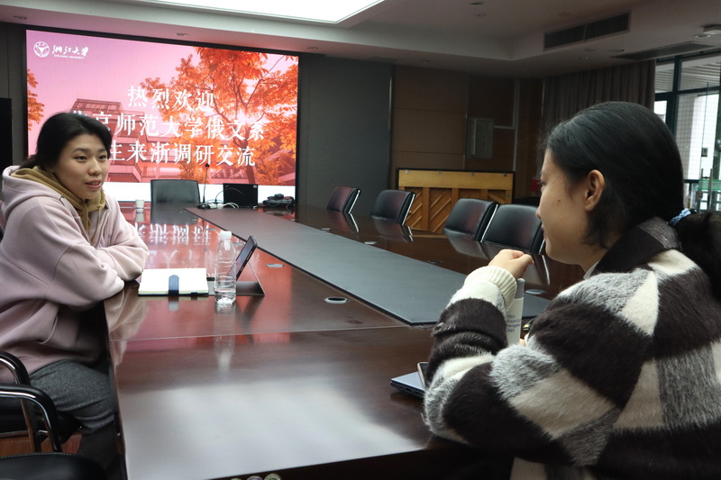 调研伊始,我校俄文系教师与浙江大学外国语学院俄语语言文化研究所副所长袁淼叙老师、薛冉冉老师以及研究所陈新宇教授、姜磊副教授举行了座谈会。